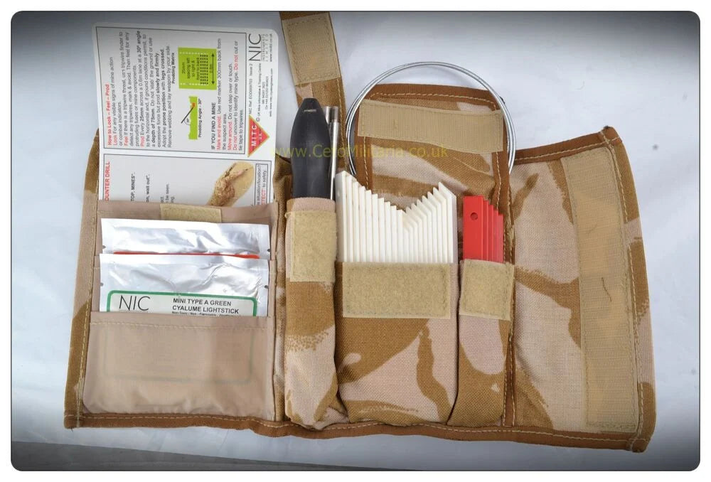 This small kit contains all the essential tools to extract from a minefield should you find yourself caught within one unexpectedly. Housed in a small Molle/Osprey pouch in Desert Camo, this kit has the following capabilities: