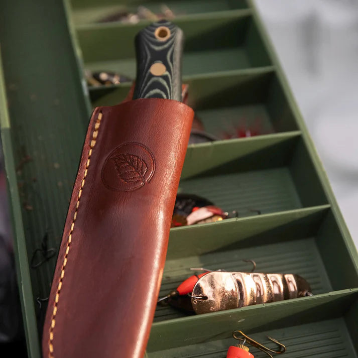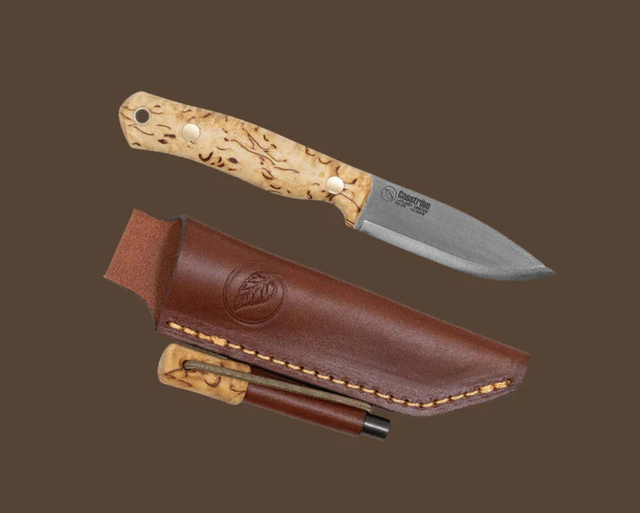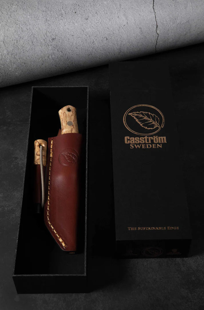 • Premium Handle Options: Choose between the elegant beauty of hand-finished Scandinavian Curly Birch or the weather resistance of tough Green Micarta – both paired with our vegetable-tanned European Leather Sheath with the stylish Casström Leaf emblem on the front face.