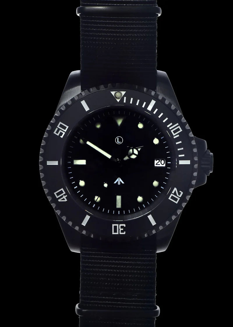 The watch measures 45mm including the crown and 40mm excluding the crown and uses the the same 20mm NATO strap as many other military divers watches. This strap size is ideal because more aftermarket strap and bracelet options are available in 20mm than any other size.