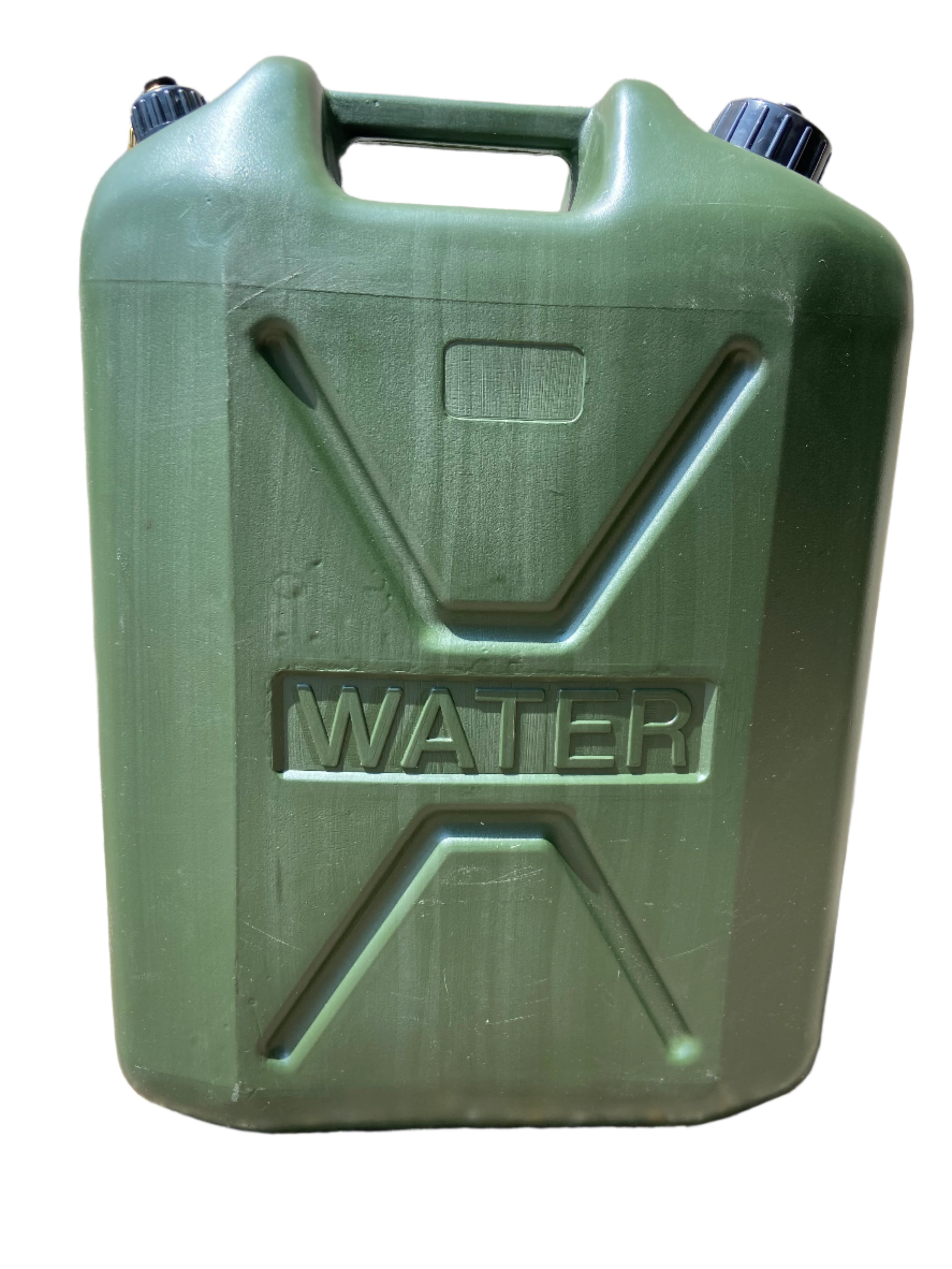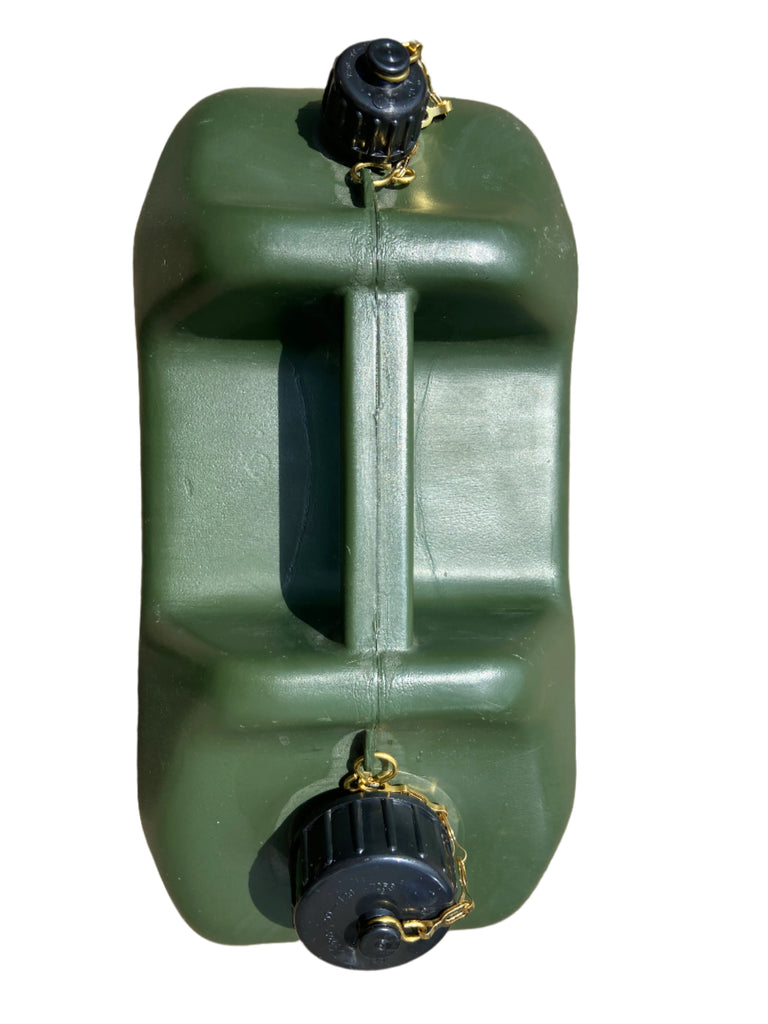 Tough 20 Litre NATO approved water container in Green. 20 Litre (4.25 Imp Gals) capacity as supplied to the British MOD and NATO.